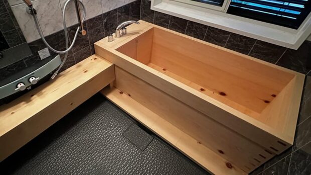 15年使い続けた木風呂を高野槙風呂に入替え 15年使用された桶風呂をリニューアル。箱風呂を設置し、周りを板で囲みました。。